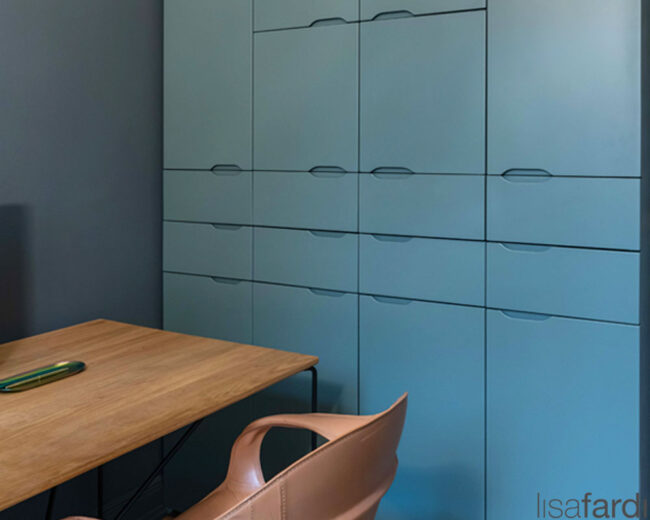 Arbeitszimmer Innenarchitektur und individuelle Möbelgestaltung Entwurf und Umsetzung: Einbauschrank mit abgerundeten Griffmulden und Bücherregale